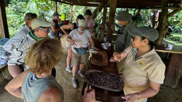 One of the most memorable days takes the group into the countryside to a family-run cacao farm. Instead of stopping at a roadside shop, guests walk the land itself. They learn how cinnamon grows, see vanilla orchids pollinated by hand, and follow cacao through each stage of its life cycle. The labor behind every step is visible. Food and materials are carried by hand. Meals are cooked over an open fire. Chocolate is made slowly, from bean to bar. The day offers a practical, firsthand understanding of the work behind cacao production and daily life on a rural farm. Seeing the labor, time, and skill behind chocolate provides context that can influence how women on our tour think about food, trade, and daily life after the tour.